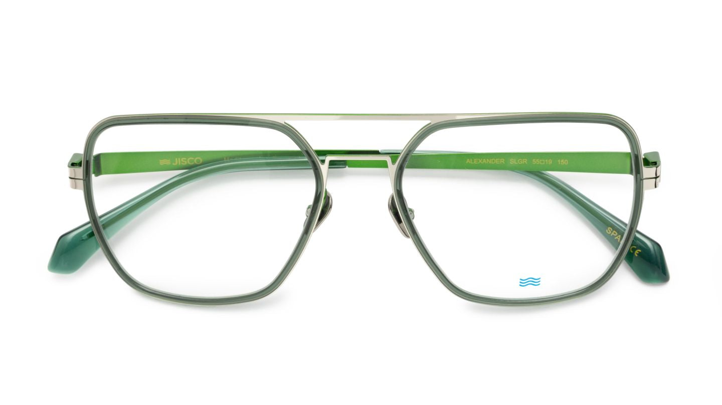 De ALEXANDER SLGR valt op door zijn oversized, vierkante pilotenmodel met dubbele neusbrug. De combinatie van mat groen en zilvergrijze accenten geeft het montuur een krachtige, sportieve uitstraling. De strakke lijnen en minimalistische afwerking zorgen voor een hedendaagse look met karakter.