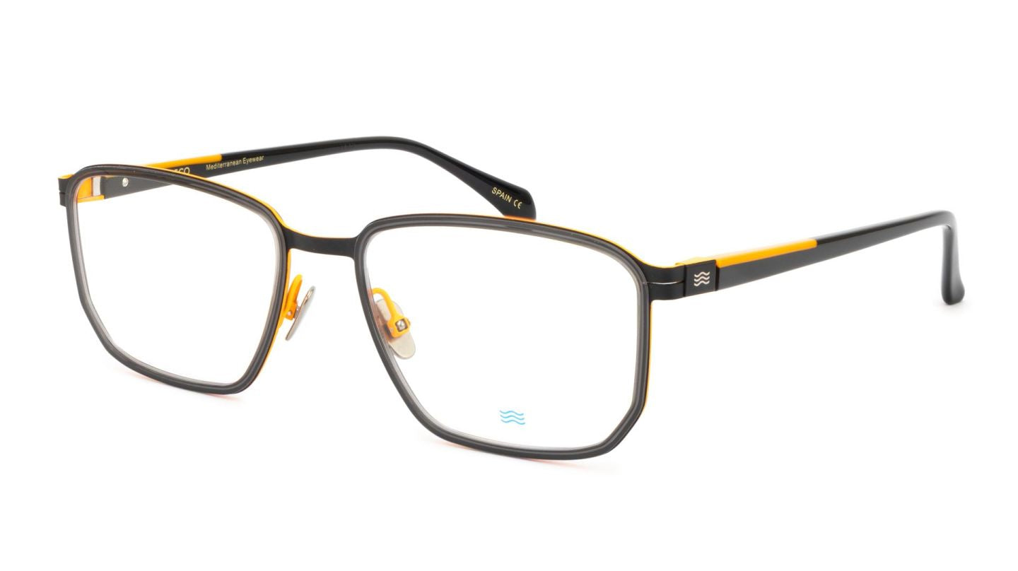 De ARES BKOR heeft een rechthoekige, licht afgeronde vorm die zorgt voor een tijdloze en veelzijdige uitstraling. De matte zwarte voorzijde wordt verfijnd afgewerkt met opvallende oranje accenten aan de binnenzijde en bij de veren. Dit contrast geeft het montuur een dynamisch en eigentijds karakter zonder overdadig te zijn.