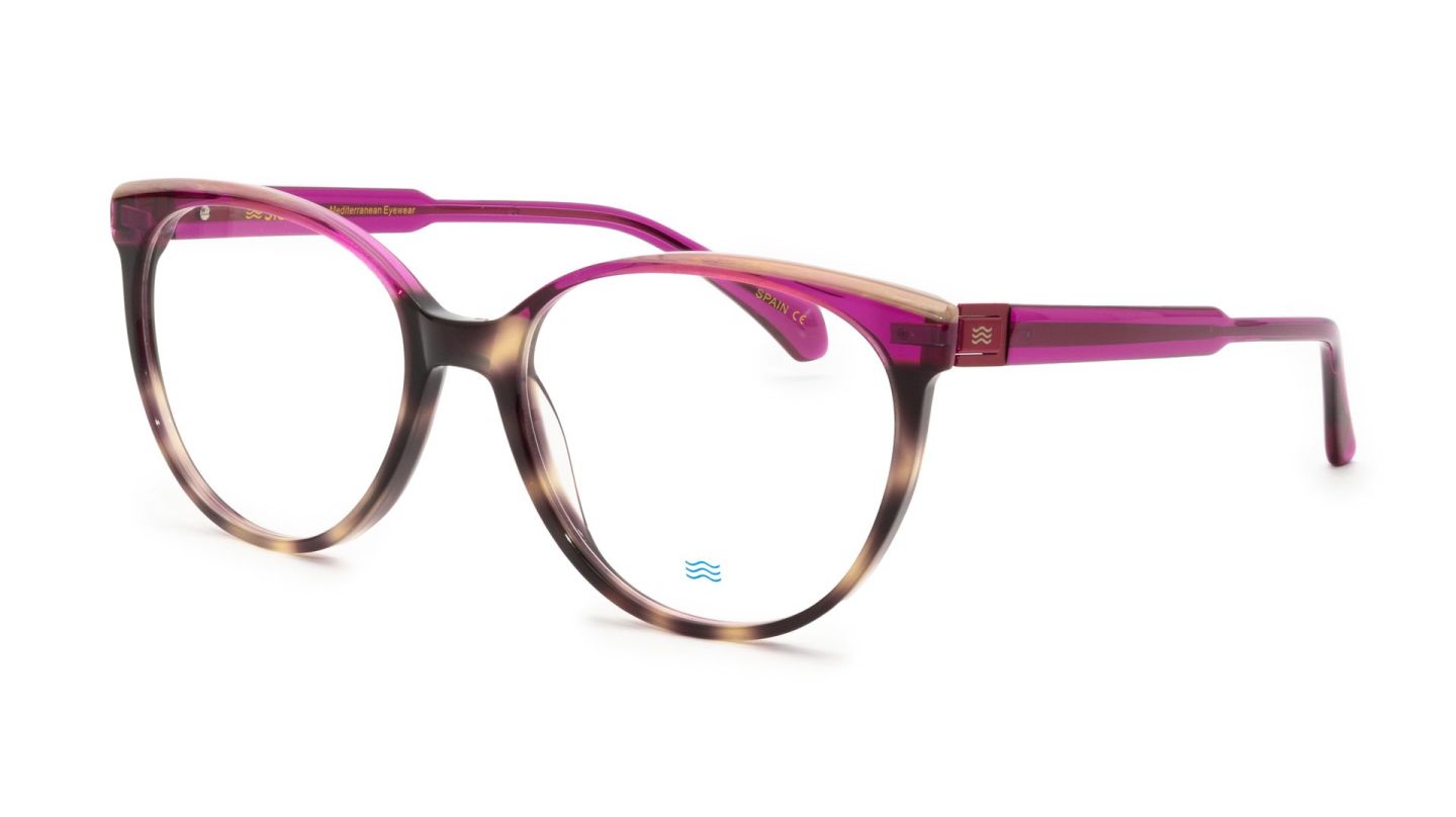 De ONA HVPU heeft een zachte, licht cat-eye geïnspireerde vorm die het gezicht flatterend omlijst. De voorzijde is uitgevoerd in een transparant gemarmerd acetaat met nuances van roos, bruin en subtiel paars, wat zorgt voor een levendig en dieptevol kleurenspel. De effen donkerpaarse veren geven het montuur rust en balans, terwijl het gouden detail aan de scharnieren een verfijnde finishing touch toevoegt.