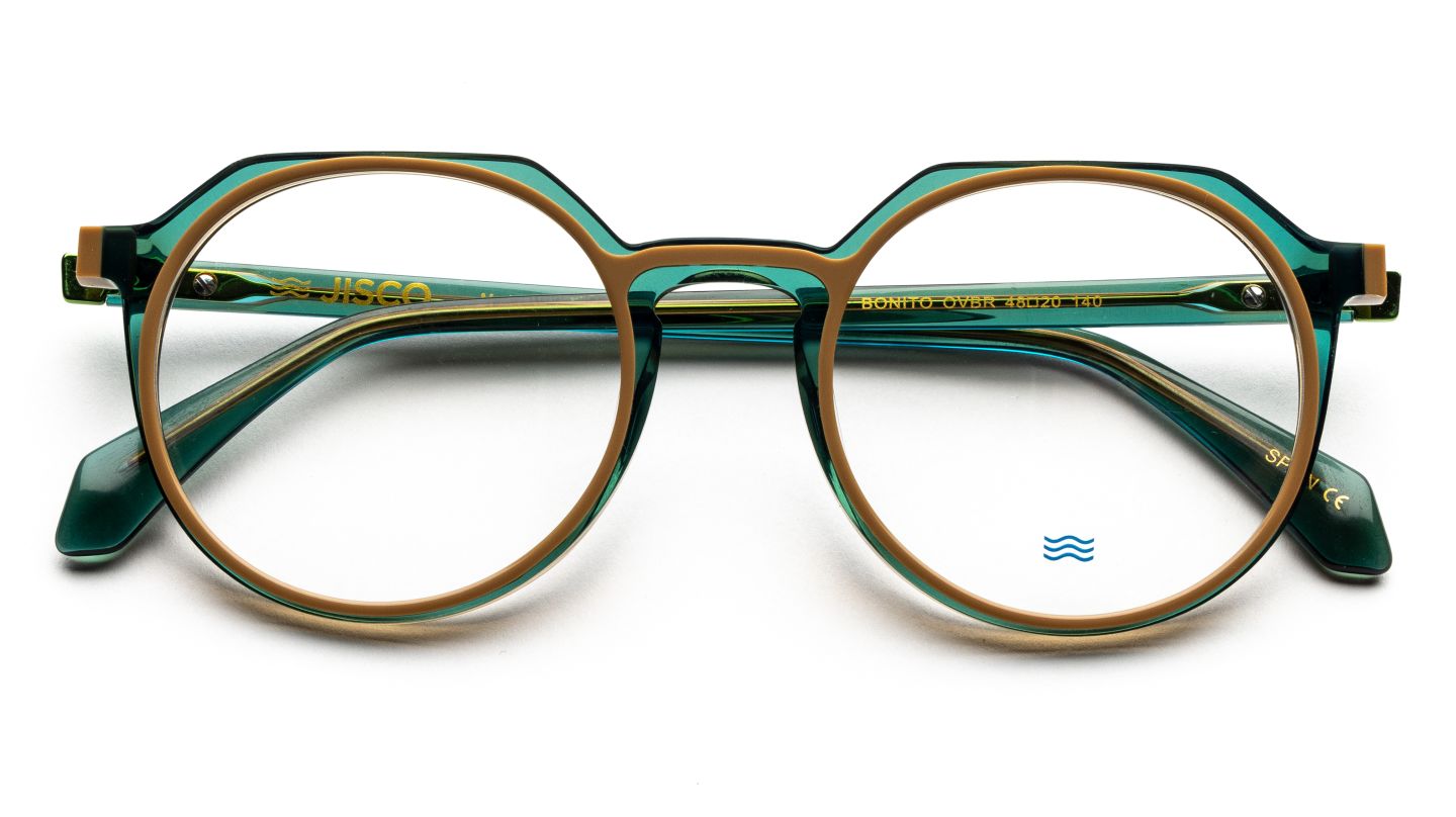 Mooi acetaat montuur in zacht groene kleur met beige omranding van het merk Jisco.