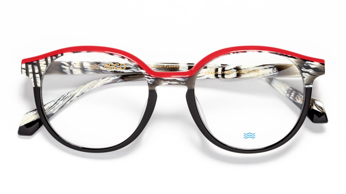De Frank HORD combineert een ronde tot licht ovale vorm met een opvallende dubbele kleurwerking. De onderzijde van het front is uitgevoerd in diep zwart, terwijl de bovenzijde wordt geaccentueerd met een levendige rode lijn die het montuur extra expressie geeft. De veren tonen een gemarmerd zwart-wit patroon met subtiele transparantie, wat zorgt voor een speels maar elegant effect.