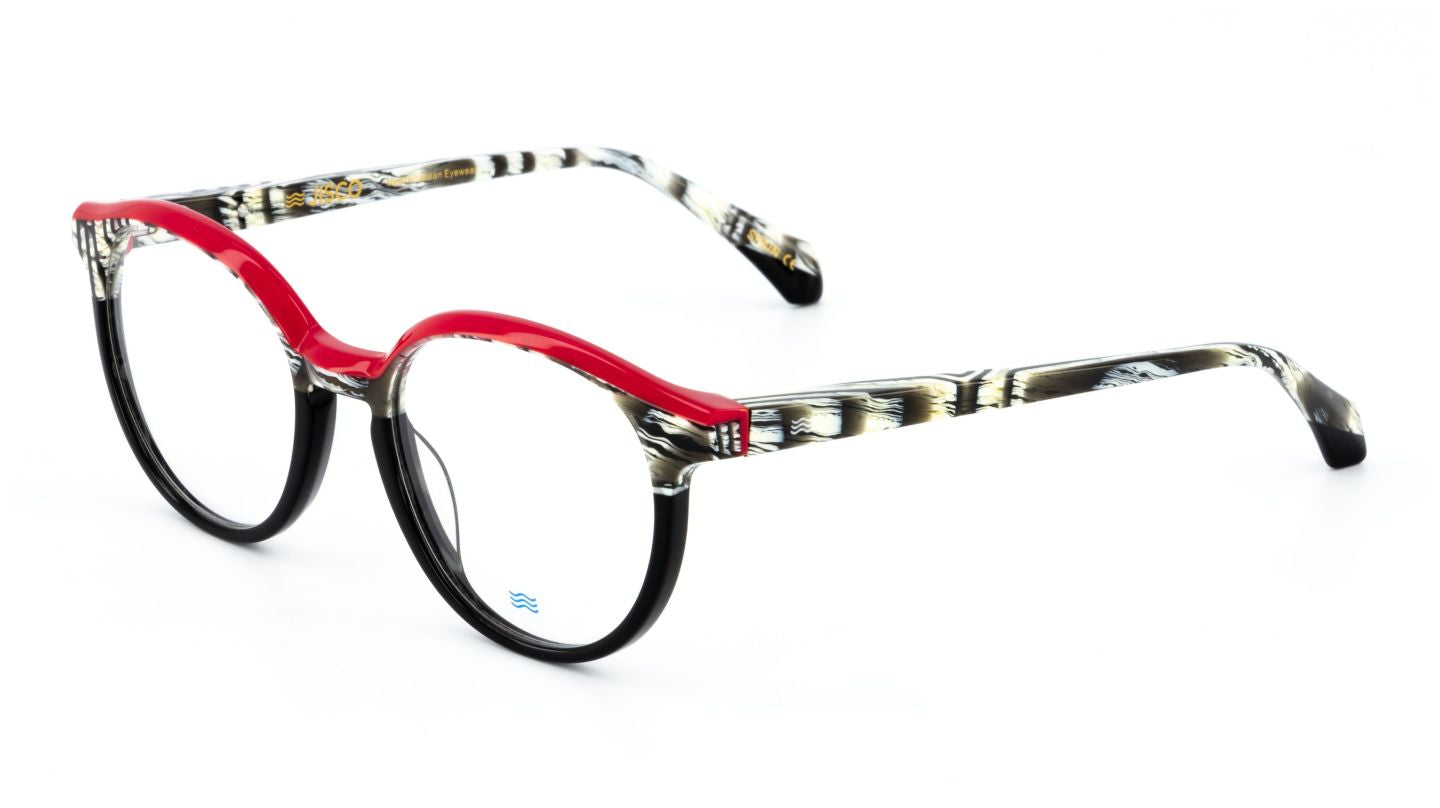 • Kleur montuur: Zwart front met rode bovenzijde en gemarmerde zwart-witte veren